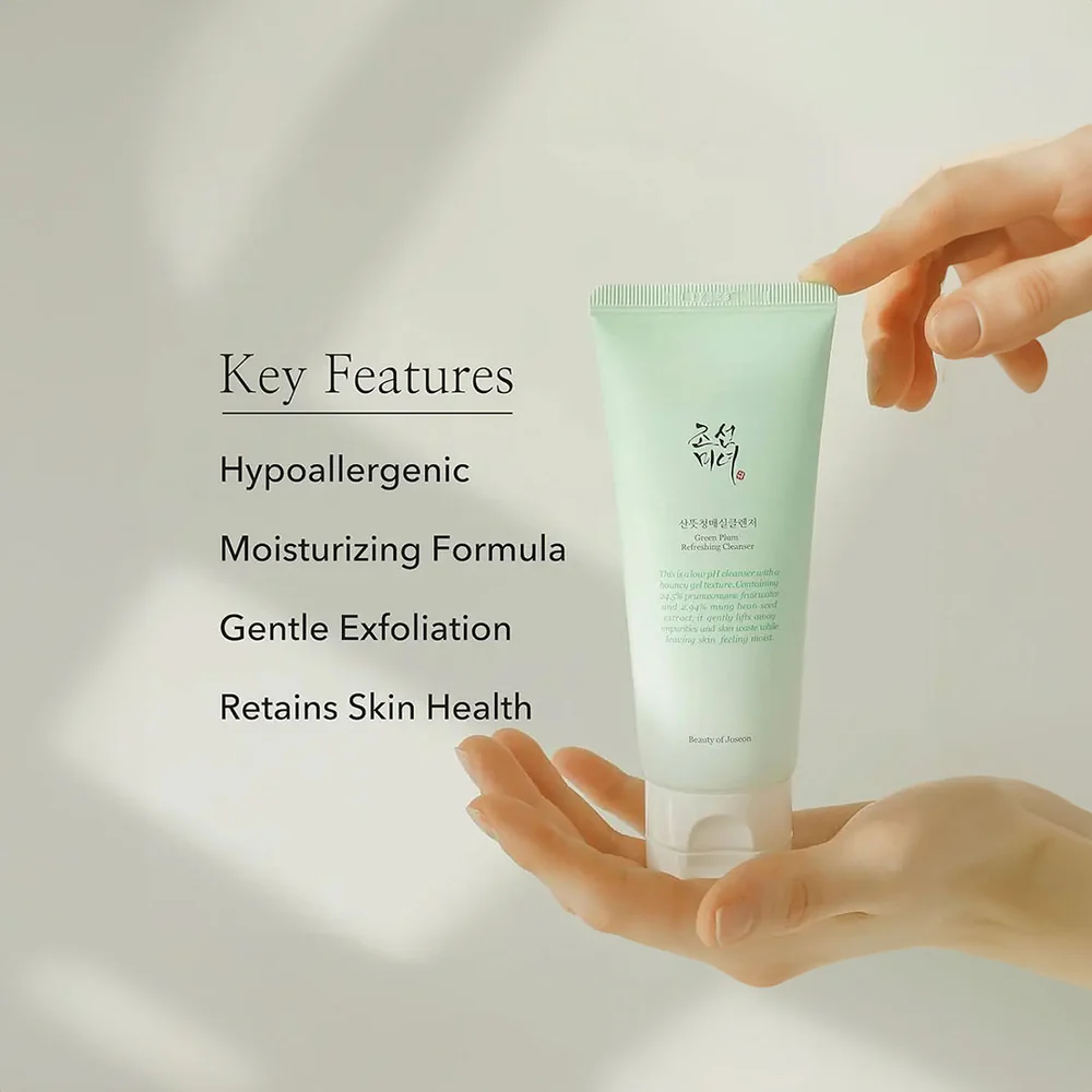 ابدئي يومك بنضارة وانتعاش مع Beauty of Joseon Green Plum Refreshing Cleanser، الغسول الكوري اللطيف المستخلص من البرقوق الأخضر وحبوب الفاصوليا.